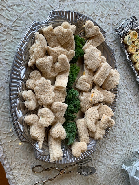 When I plan for a more intimate gathering, I plan all the food. I will have sandwiches, scones, muffins, fruit, and assorted desserts. Karen and I agree that cucumber sandwiches are a staple item. Be cognizant of any dietary needs and food allergies.