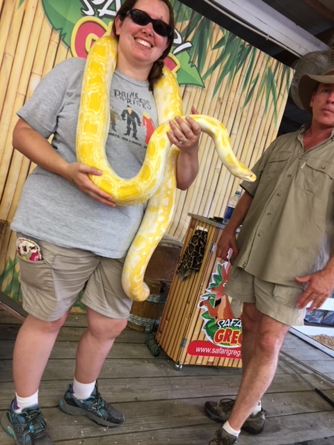 Walking the reptile house, however, became a repetitive act which helped navigate my fear. The first time I flew through there and got out quickly. Eventually, I was able to come closer and stay longer. Now, I just have a twinge of discomfort and can spend a lot of time there. I even have allowed a couple of boa constrictors around my neck for pictures.